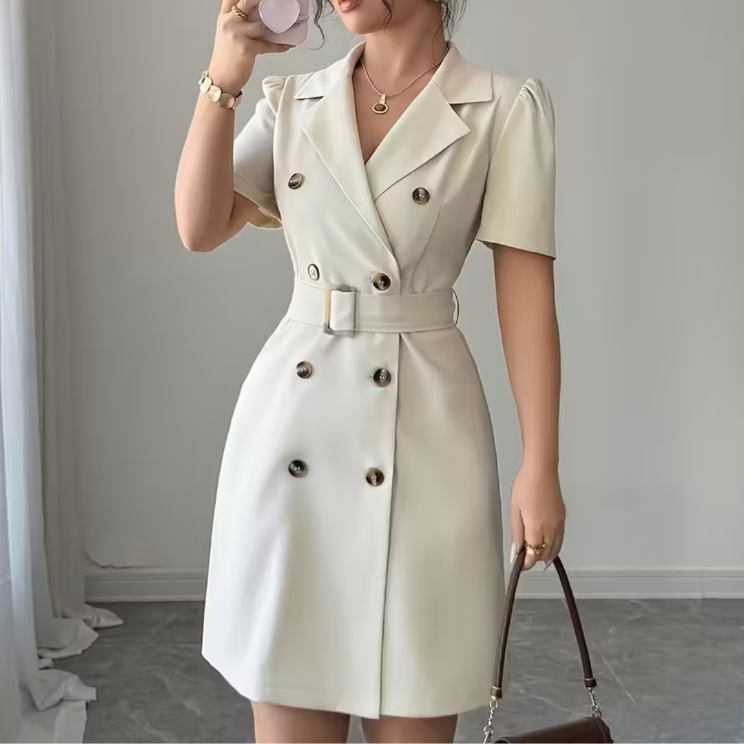 Women’s Light Beige Double-Breasted Blazer Dress with Belt